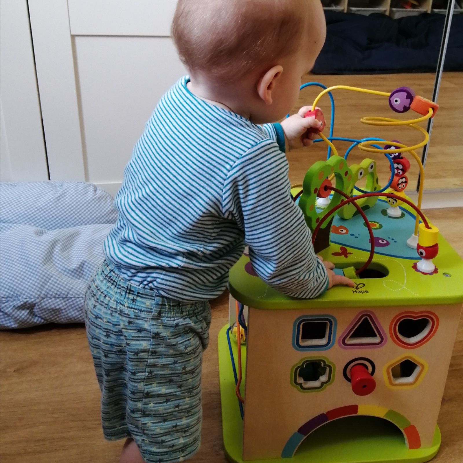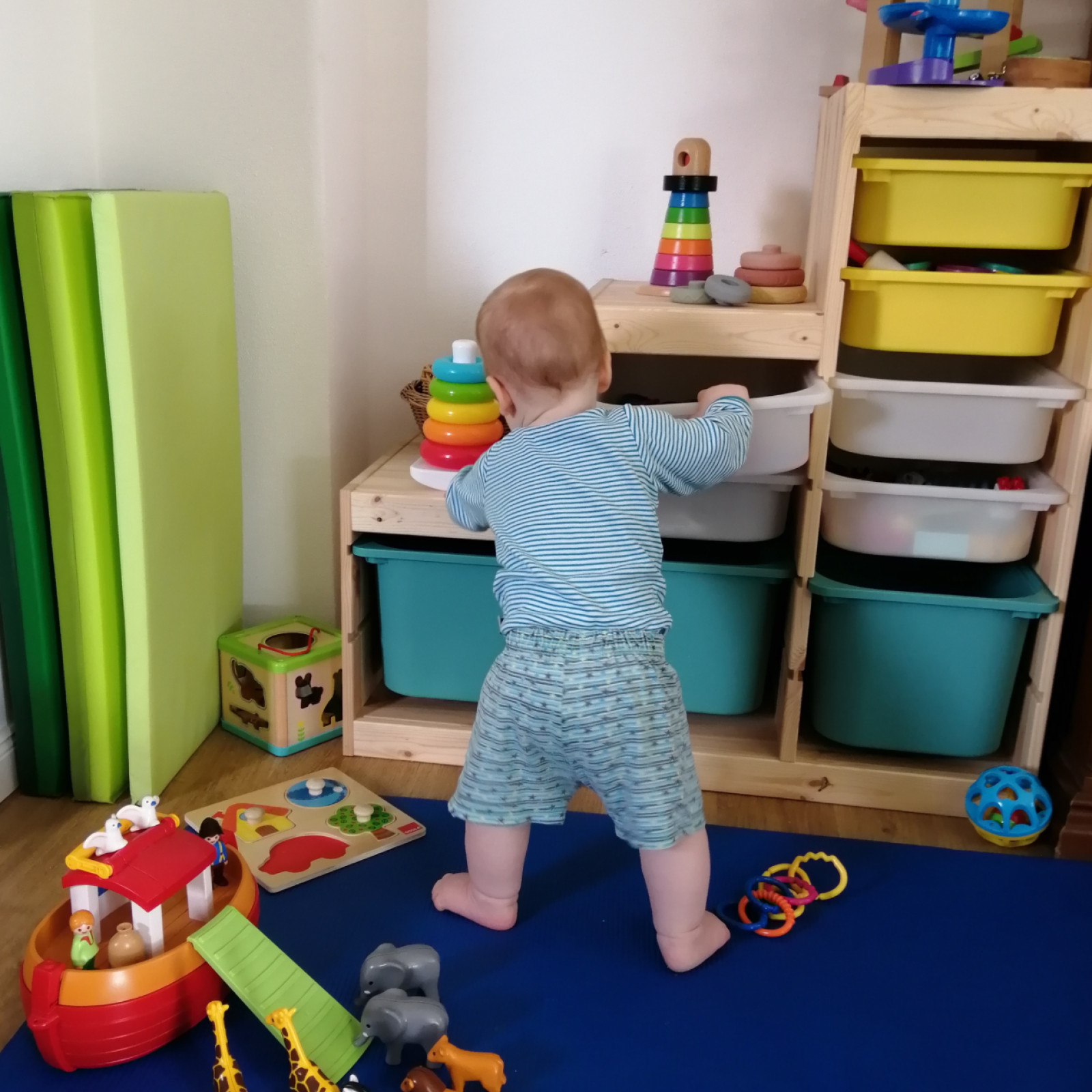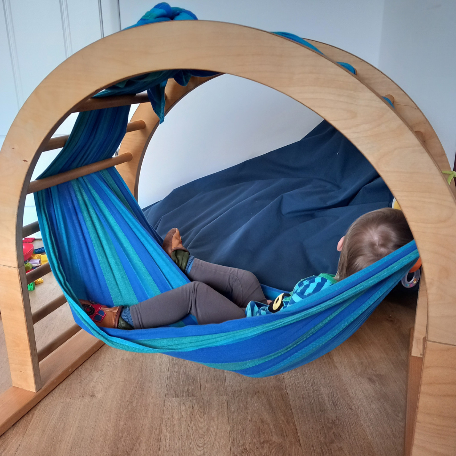 Spielbereich: Hochwertiges, altersgerechtes Spielzeug, Bücher und ein großer Pikler-Spielbogen laden zum kreativen Spiel ein.